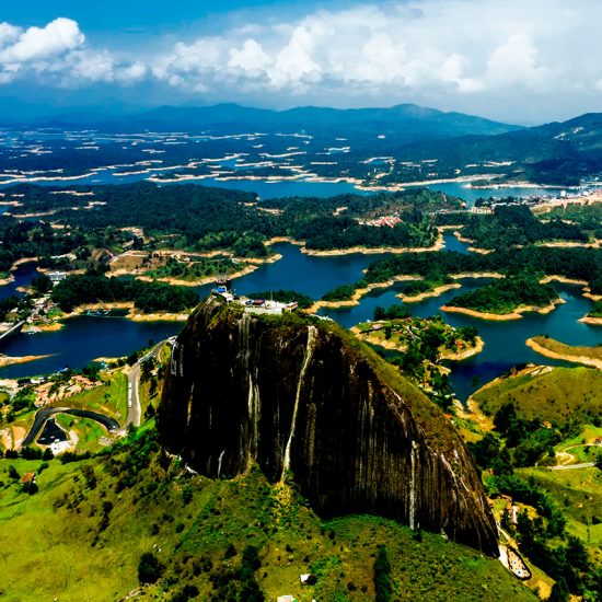 An English-speaking guide will pick you up at the hotel for your journey by public transport to Guatapé, which is at a two-hour drive from Medellín. Once there, you will have time to explore the 19th-century colonial village, with its houses painted in all colors of the rainbow and narrow cobblestone streets. After the visit to Guatapé you will continue to the nearby Piedra de Peñol, a 220-meter-high, ancient rock formation that you can climb by taking the 740 stairs. It is a big climb, but the stunning view from the top over the huge Peñol-Guatapé reservoir definitely makes up for it. In the afternoon you will travel back to Medellín.