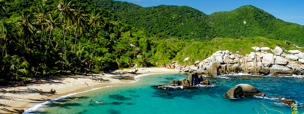 Tayrona National Park is undoubtedly one of the most important natural reserves in Colombia. Its small, pristine, clear blue beaches in the Caribbean Sea, lined with palm trees and rocks that resemble huge bird eggs, are impressive. Plus, at sunset, you can hear the sounds of howler monkeys from the nearby rain forest. The natural reserve, just 35 kilometers from the city of Santa Marta, has 29,640 acres of jungle and the most beautiful beaches in Colombia. For thousands of years, the area has been inhabited by the Tayrona, whose descendants still live in the park.